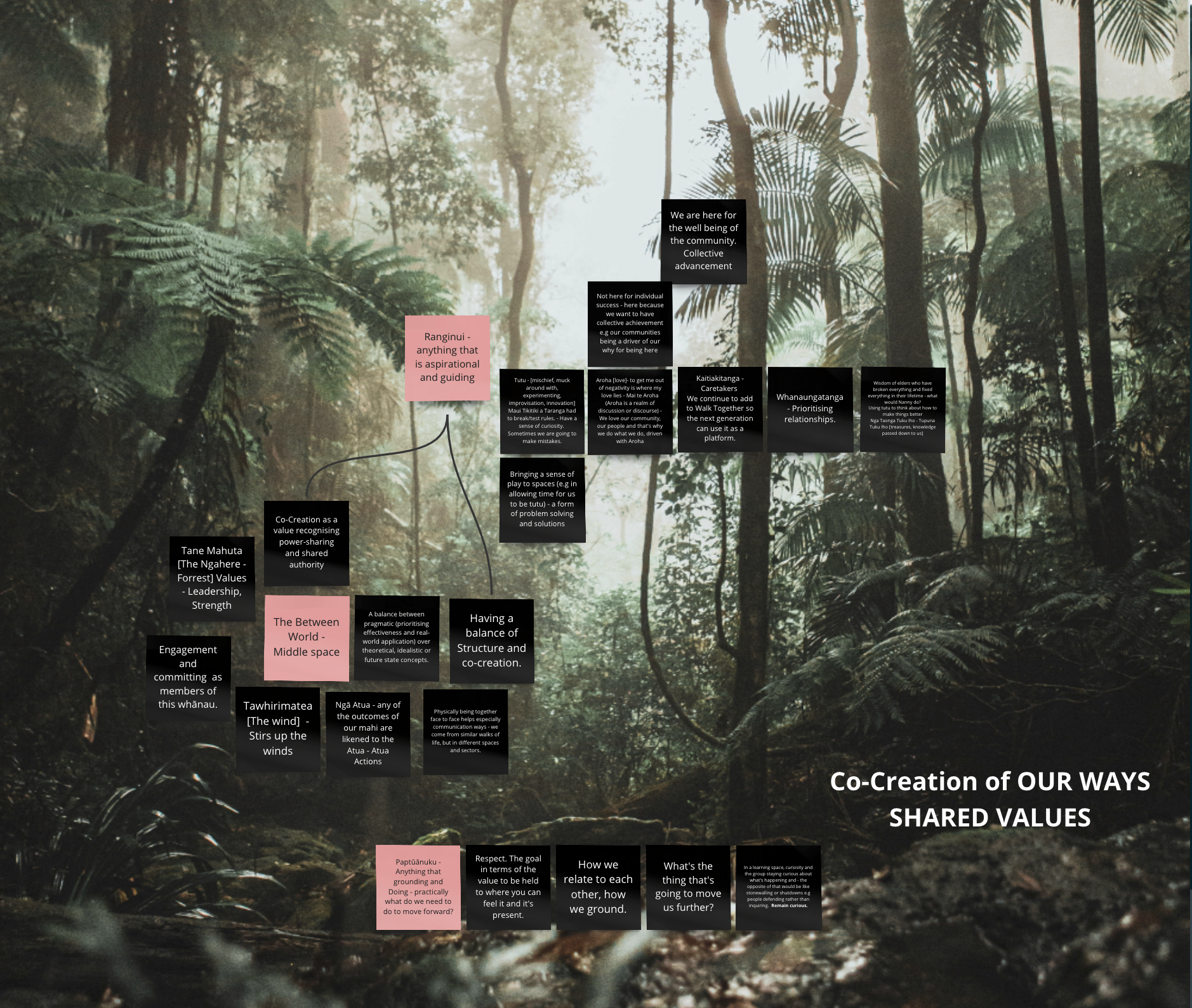 Adopting a dual strategy, our whānau is immersed in learning Walk Together's methodologies, tools, and frameworks as we progress along our journey. In this case, while we co-create a set of shared values as Our Ways, participants are observing how a collective can come together and agree on things like values.